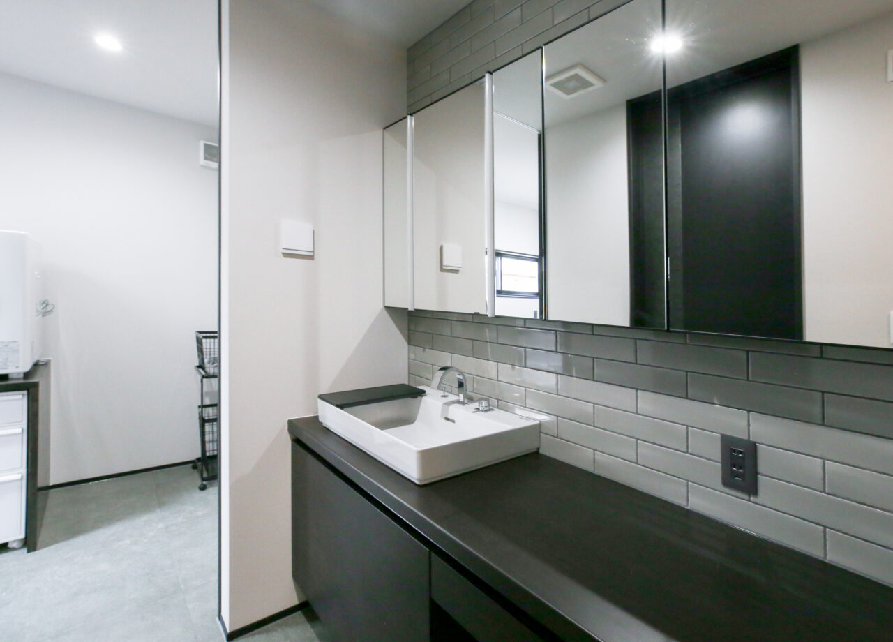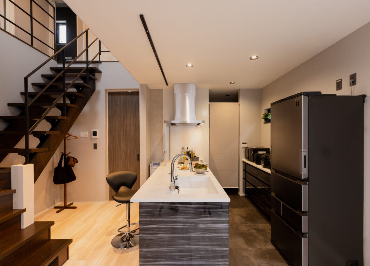 サロン併設の住まいで、暮らしと仕事を両立。外観はシンプルなキューブ型、住居はグレイッシュトーンでモダンに。サロンは北欧テイストの柔らかな空間とし、異なる世界観が調和する住まいです。