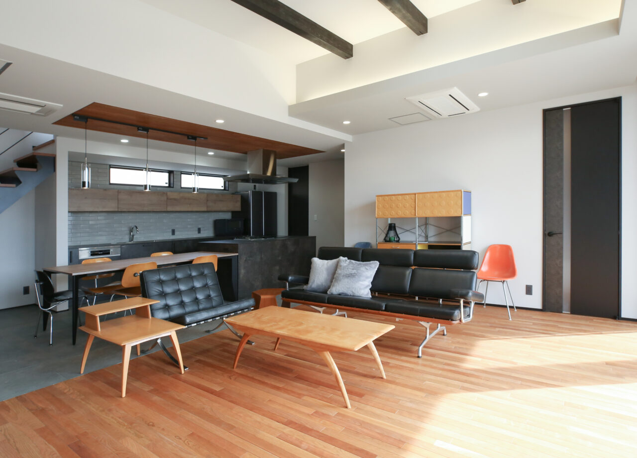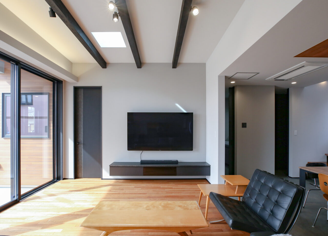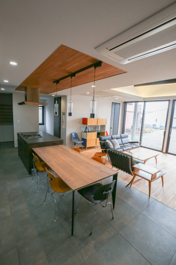 無垢材と磁器タイル床を組み合わせた上質な住まい。大開口窓や天窓で LDKは庭とつながる開放的な空間に。収納やパントリーを備え、デザインと快適さを両立しました。